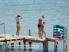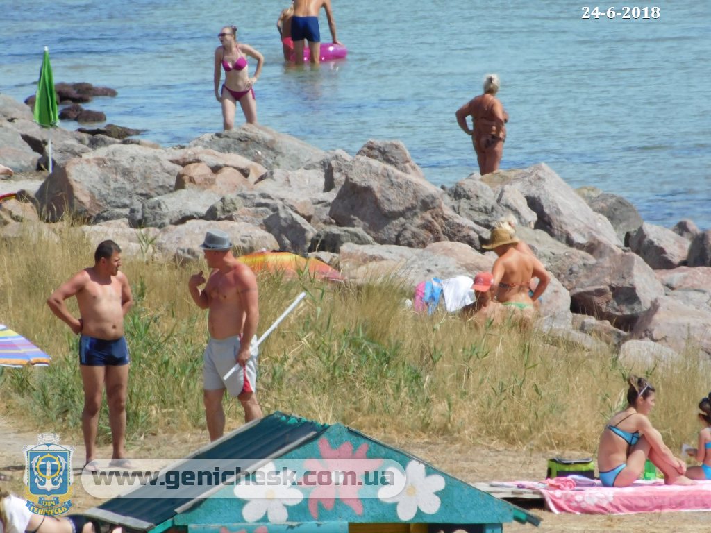 В Геническе пляж под горой (на камушках)