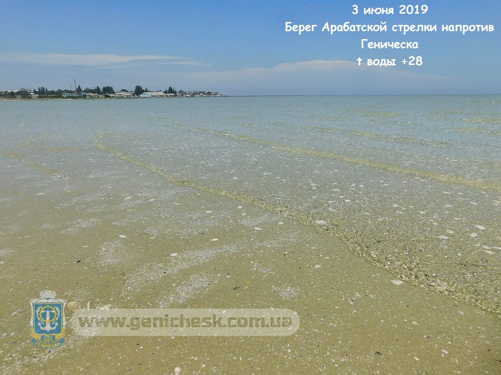 3 июня 2019 Берег Арабатской стрелки напротив Геническа t воды +28 "напротив городского пляжа, через пролив, на первом километре Арабатской стрелки есть один из невидных пляжей Геническа. "