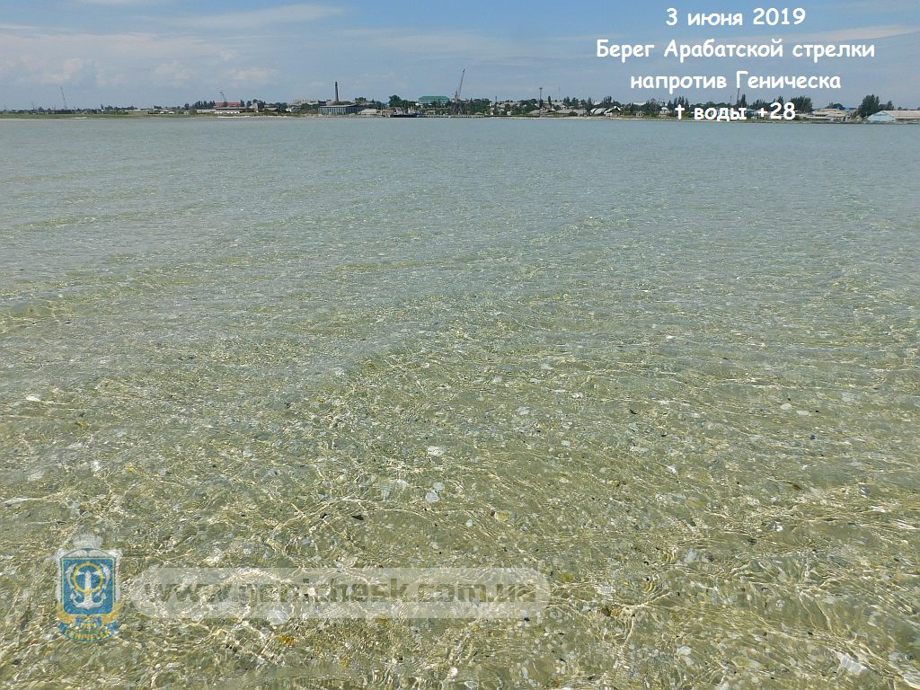 3 июня 2019 Берег Арабатской стрелки напротив Геническа t воды +28 "напротив городского пляжа, через пролив, на первом километре Арабатской стрелки есть один из невидных пляжей Геническа. "