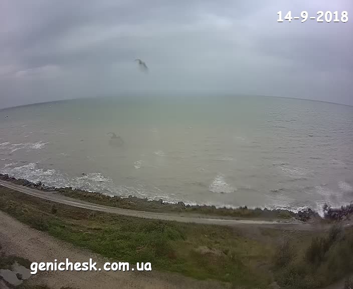 Берег моря в Геническе в легкий шторм и дождь сегодня (скриншот с генической вебкамеры)