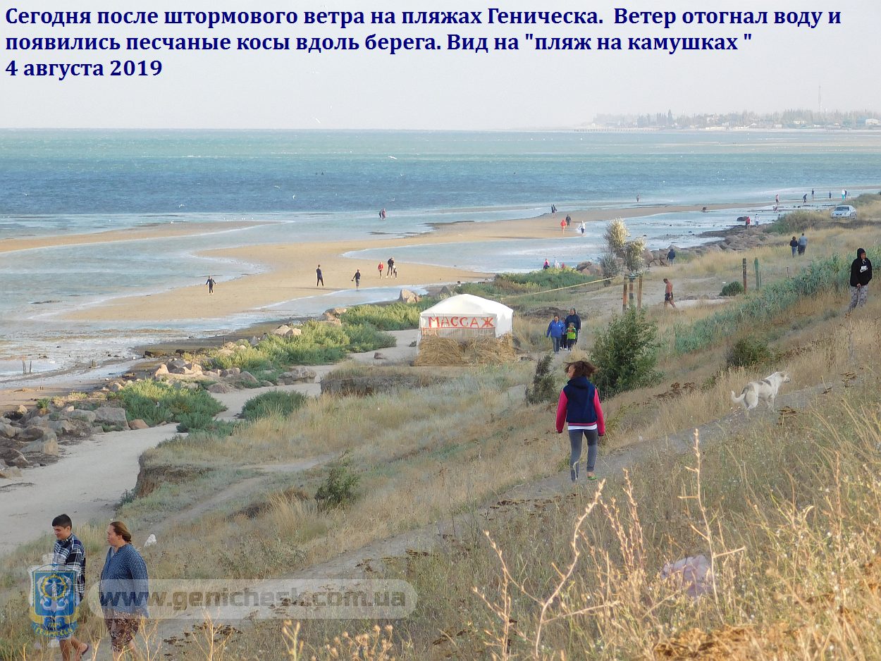Сегодня после штормового ветра на пляжах Геническа. Ветер отогнал воду и появились песчаные косы вдоль берега. Вид на "пляж на камушках " 4 августа 2019