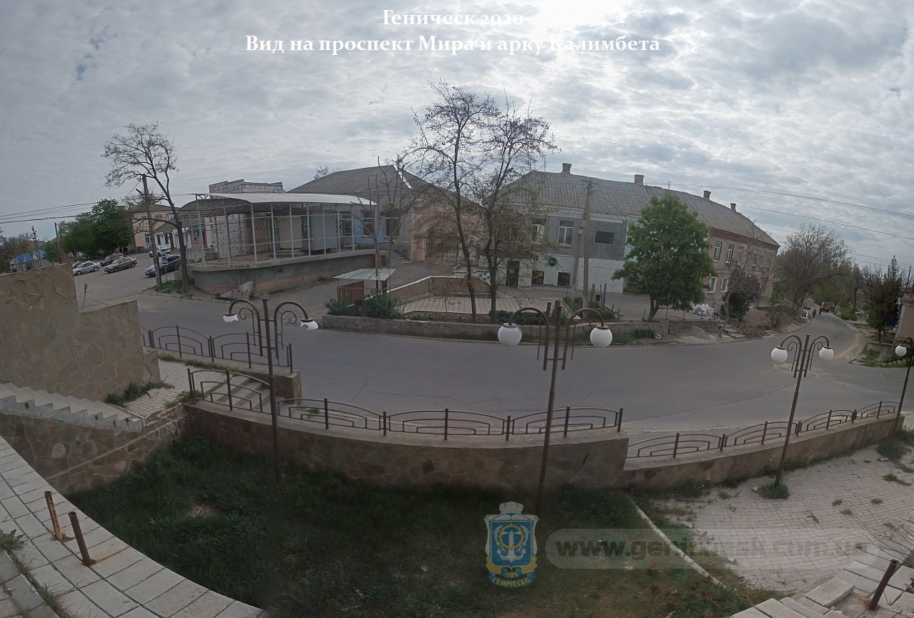 Геническ 2020 - апрель 27. Вид на проспект Мира и арку Калимбета